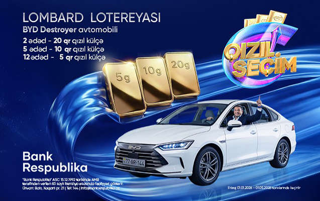 1 may tarixinədək "Bank Respublika"dan min.500 AZN və daha çox məbləğdə sərfəli şərtlərlə lombard krediti götürün, "Qızıl Seçim" lotereyasının iştirakçısına çevrilin, qiymətli hədiyyələrdən birinin sahibi olmaq şansını əldə edin!