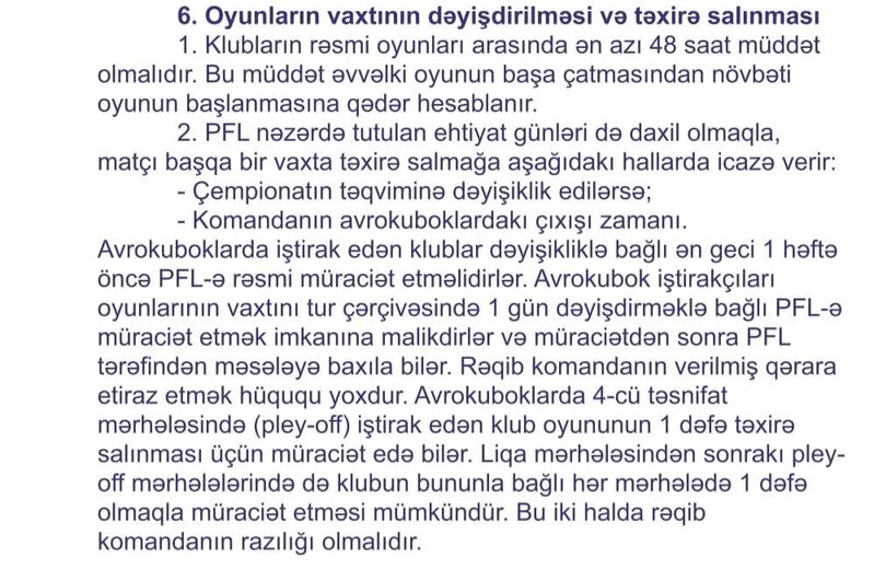 Belə ki, matç əgər bir gün təxirə salınırsa, buna heç bir tərəf etiraz edə bilməz. Yox, əgər matçın vaxtı qeyri-müəyyən müddətə dəyişirsə, bu zaman hər iki tərəfin razılığı olmalıdır.